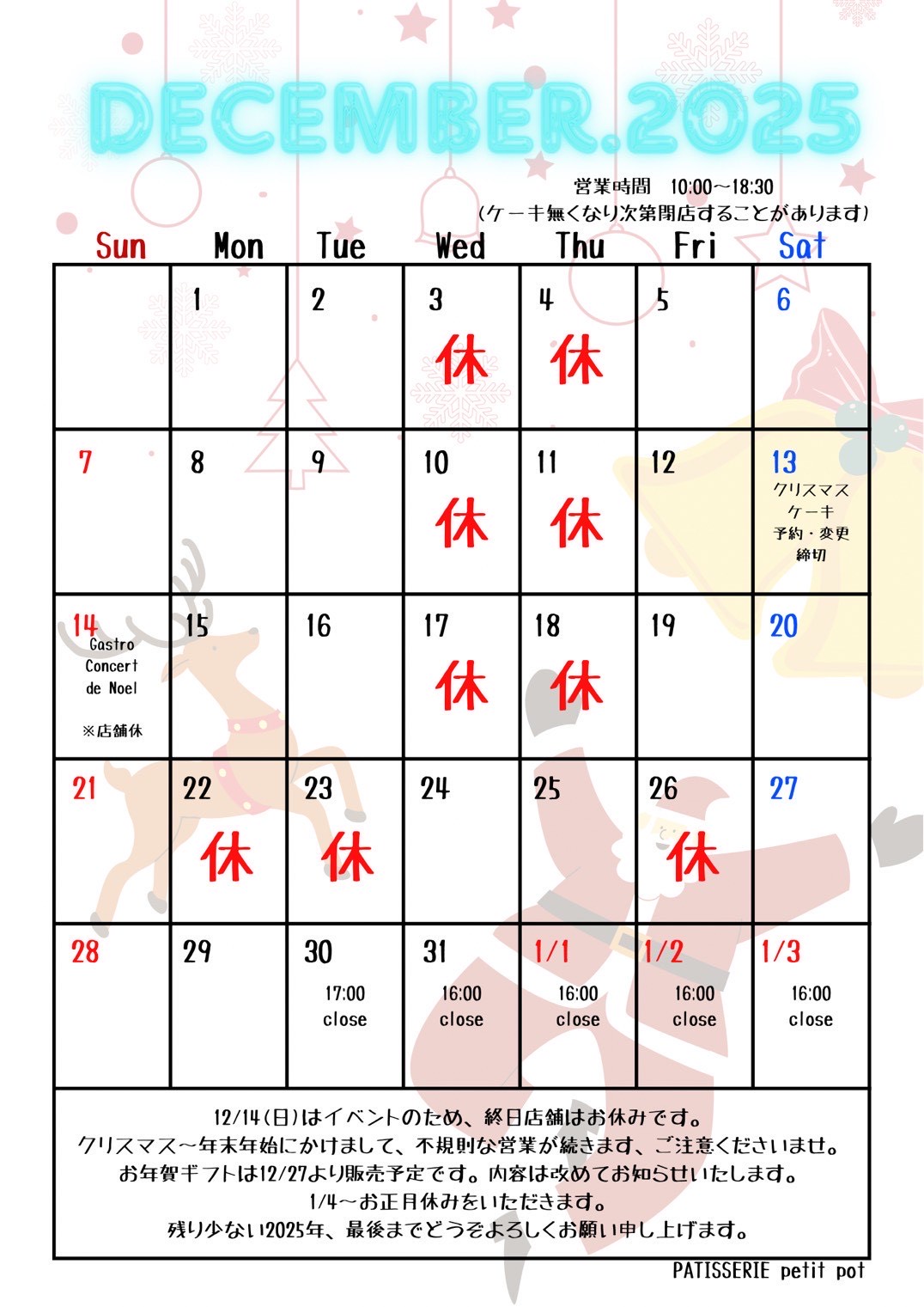 今年のクリスマスは水曜と木曜…不規則な営業となります。